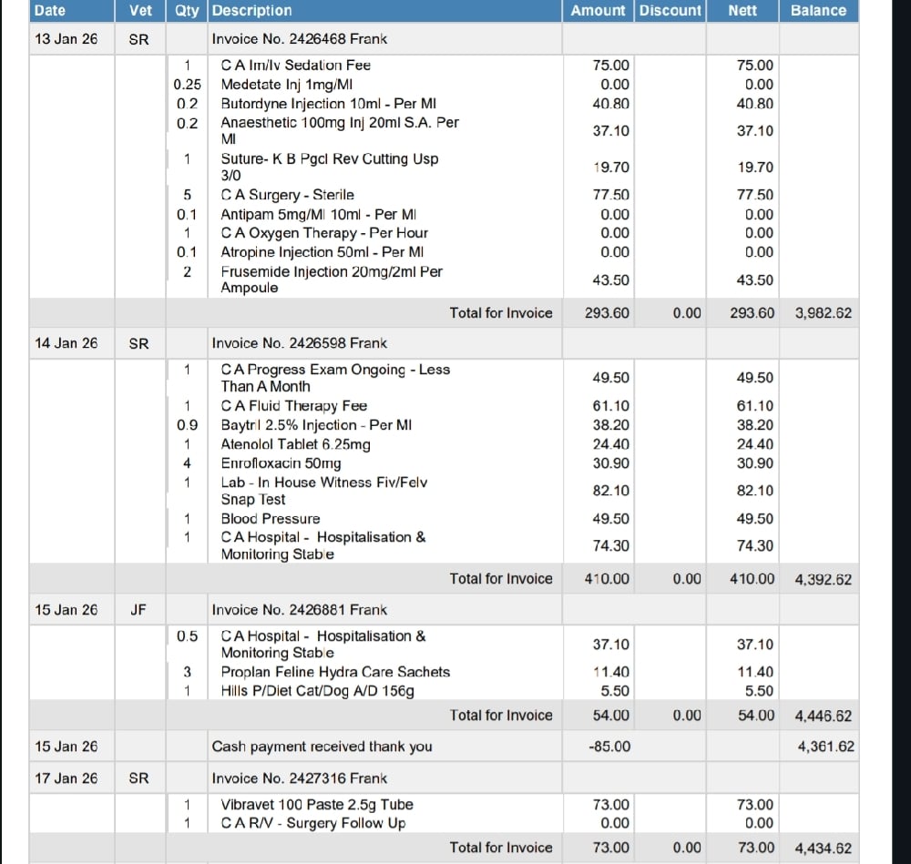 Frank has Feline Leprosy and is currently in the middle of treatment. She has had surgery to remove the lesions and is now on three different antibiotics. During her second surgery she has a bad reaction to some of the meds and this has left her with some blindness. We are hoping it will return, we are already seeing improvement.